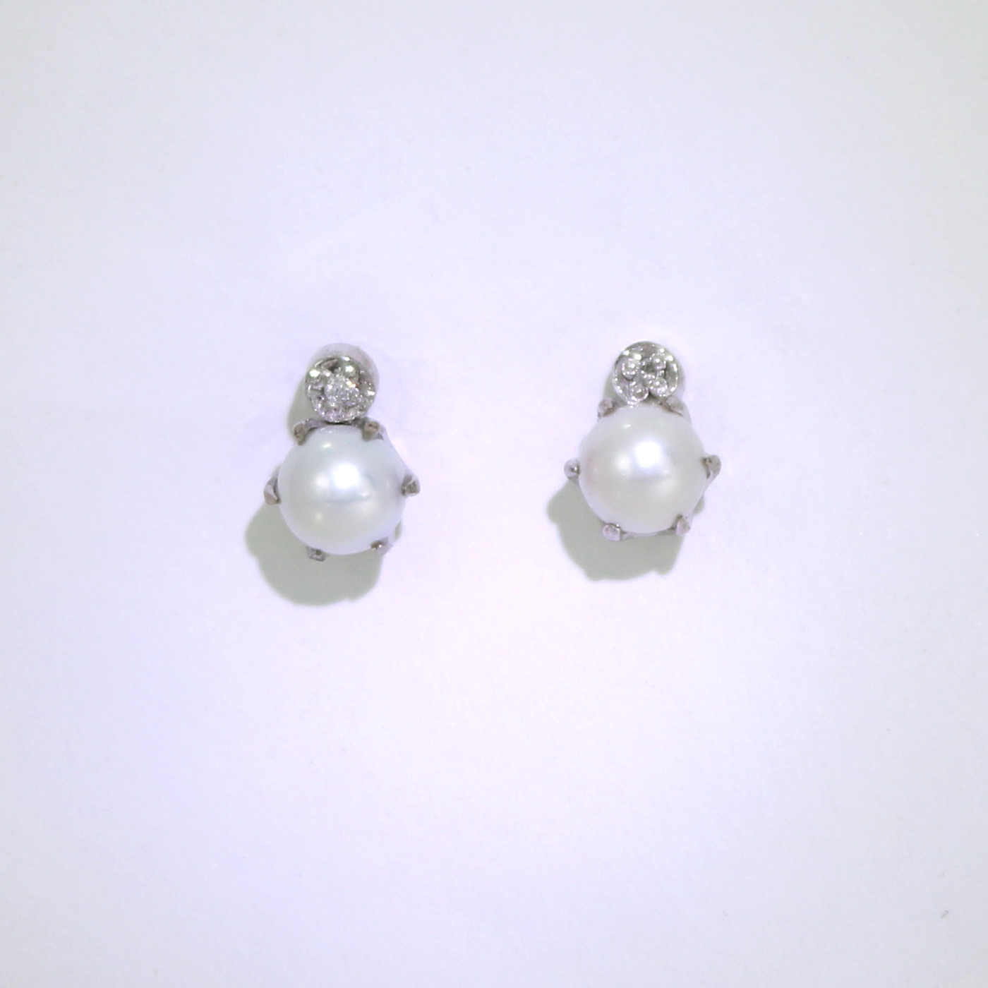 Valkokultaiset 5 mm helmikorvakorut 0.02 ct timanteilla. Klassiset ja sievät helmikorvakorut timanteilla, kotimaista käsityötä. Runko 14 karaatin valkokultaa, 5 mm:n viljeltyjen helmien seurana yht. 0.02 ct timantit.